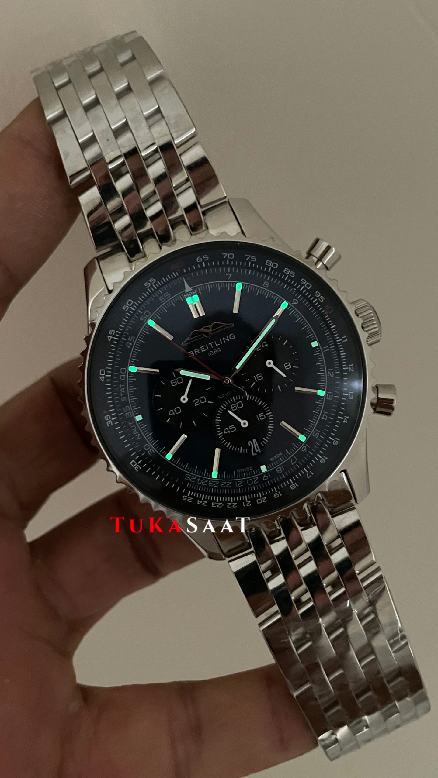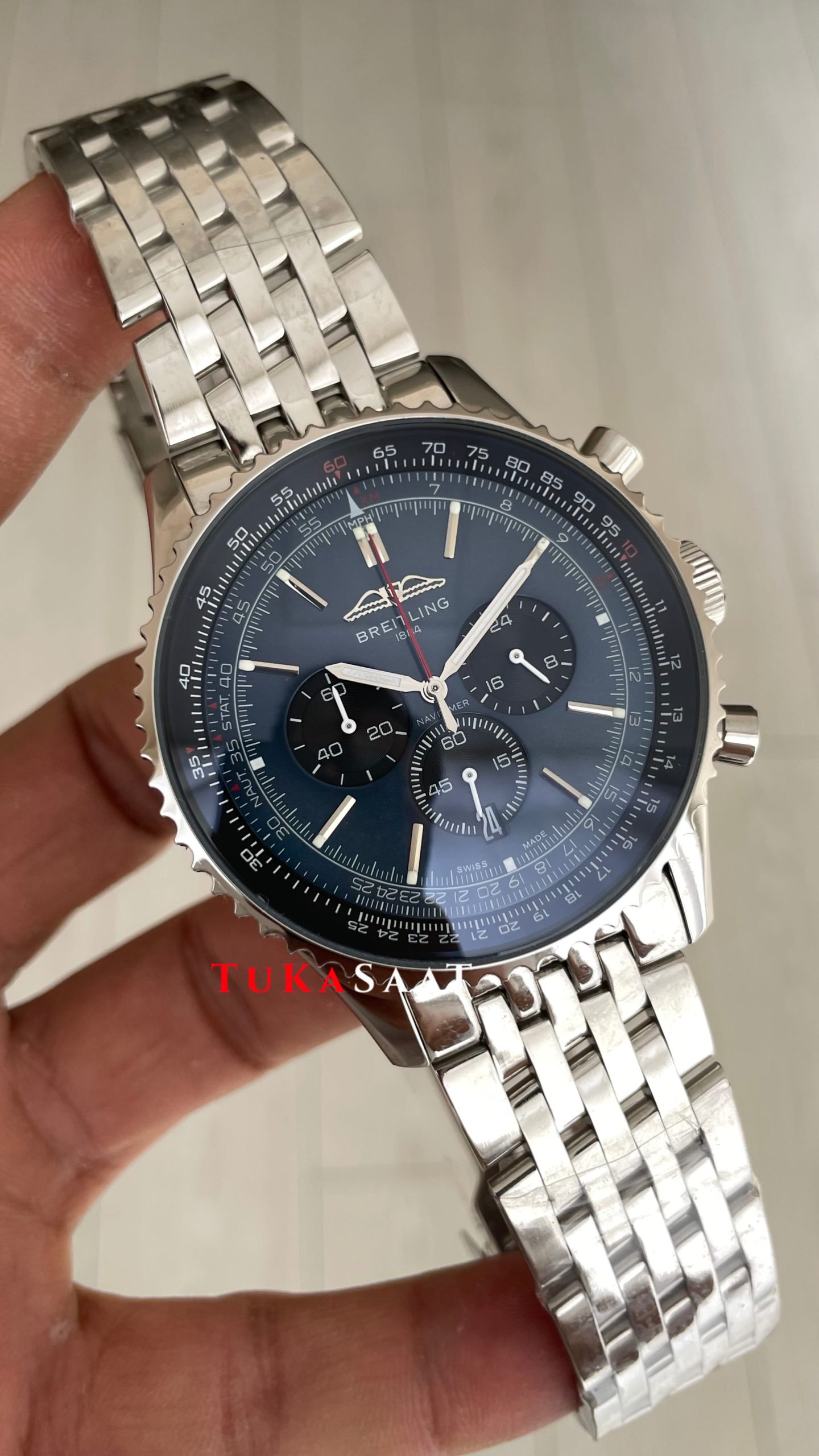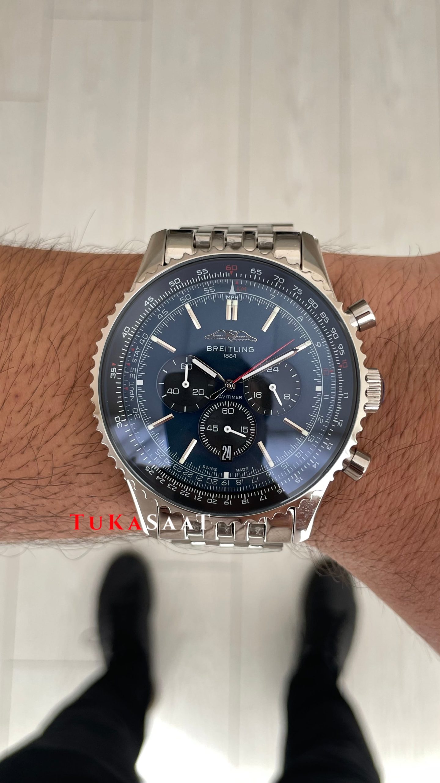 Breitling Navitimer B01 Chronograph AB0139 Mavi 43mm Erkek Kol Saati modeli, kendine has tarzıyla geniş yuvarlak parlak çelik kasası, çelik bileziği, ufak yivli çelik çerçeveli bezeli, çift katmanlı bombeli safir camı, çekmeli tepesi (kurma kolu), pilli mekanizması, siyah renkli kadranı ve 46 mm kasa çapı ölçüsü ile en çok talep edilen modellerimizden biri olmayı başarmıştır. Bu saatin paslanmaz çelik kasası ve çelik bileziğiyle dayanıklılığı, sağlamlığı ve kullanım kolaylığını bir arada sağlayarak saatin kullanımını daha keyifli ve kolay hale getiriyor.