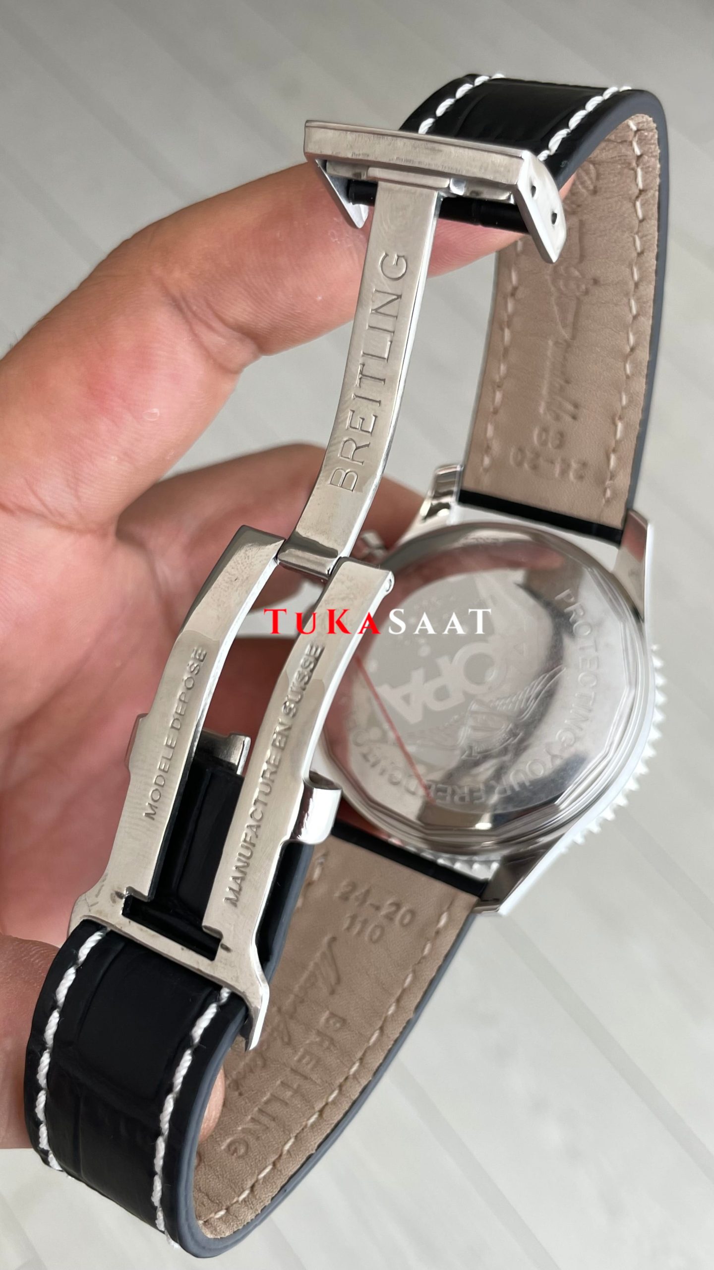 Breitling Navitimer B01 Chronograph Panda AB0127 Beyaz Kadran 45mm Erkek Kol Saati modeli, kendine has tarzıyla geniş yuvarlak parlak çelik kasası, deri kayışı, ufak yivli çelik çerçeveli bezeli, çift katmanlı bombeli safir camı, çekmeli tepesi (kurma kolu), pilli mekanizması, yeşil renkli kadranı ve 45 mm kasa çapı ölçüsü ile en çok talep edilen modellerimizden biri olmayı başarmıştır. Bu saatin paslanmaz çelik kasası ve deri kayışıyla dayanıklılığı, sağlamlığı ve kullanım kolaylığını bir arada sağlayarak saatin kullanımını daha keyifli ve kolay hale getiriyor.