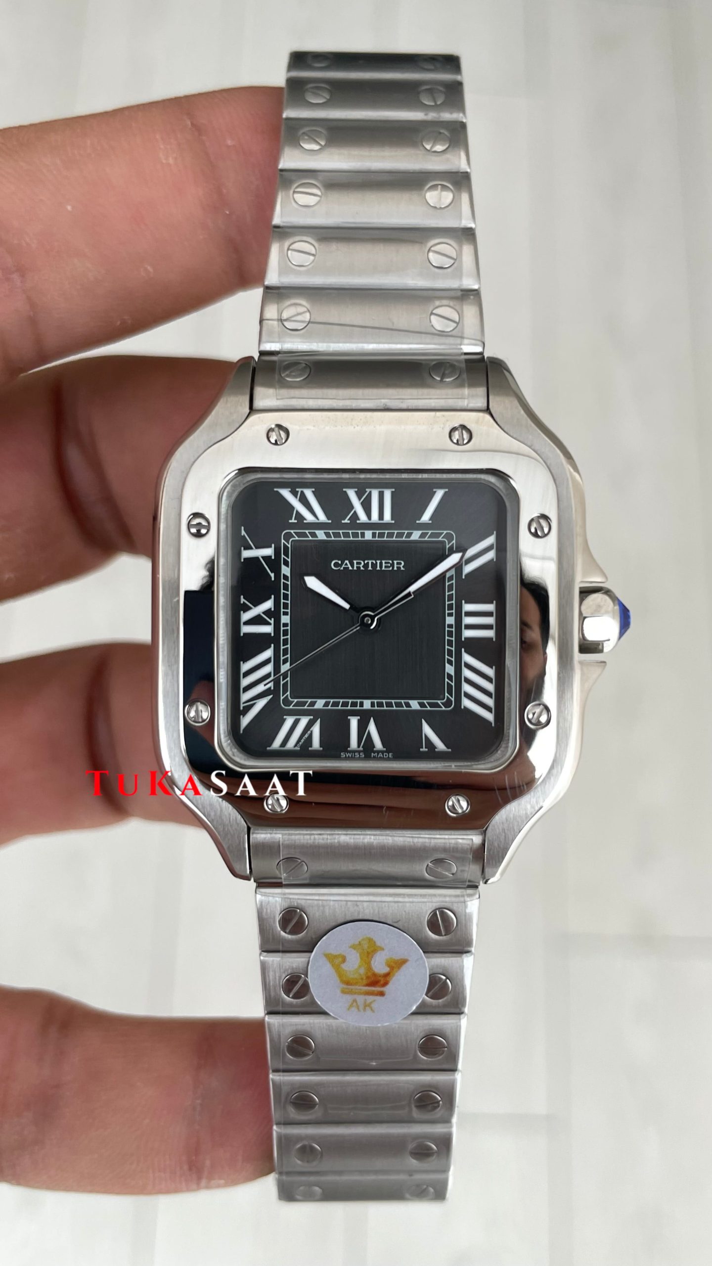 Cartier Santos WSSA0061 Gri Kadran 35mm Medium Kadın Kol Saati modeli, kendine has tarzıyla slim kare çelik kasası, ince çelik vidalı bileziği, parlak çelik bezeli, çift katmanlı bombeli safir camı, çekmeli tepesi (kurma kolu), pilli mekanizması, romen rakamlı indeksli kadranı ve 40mm kasa çapı ölçüsü ile en çok talep edilen modellerimizden biri olmayı başarmıştır. Bu saatin paslanmaz çelik kasası ve paslanmaz çelik bileziğiyle dayanıklılığı, sağlamlığı ve kullanım kolaylığını bir arada sağlayarak saatin kullanımını daha keyifli ve kolay hale getiriyor.