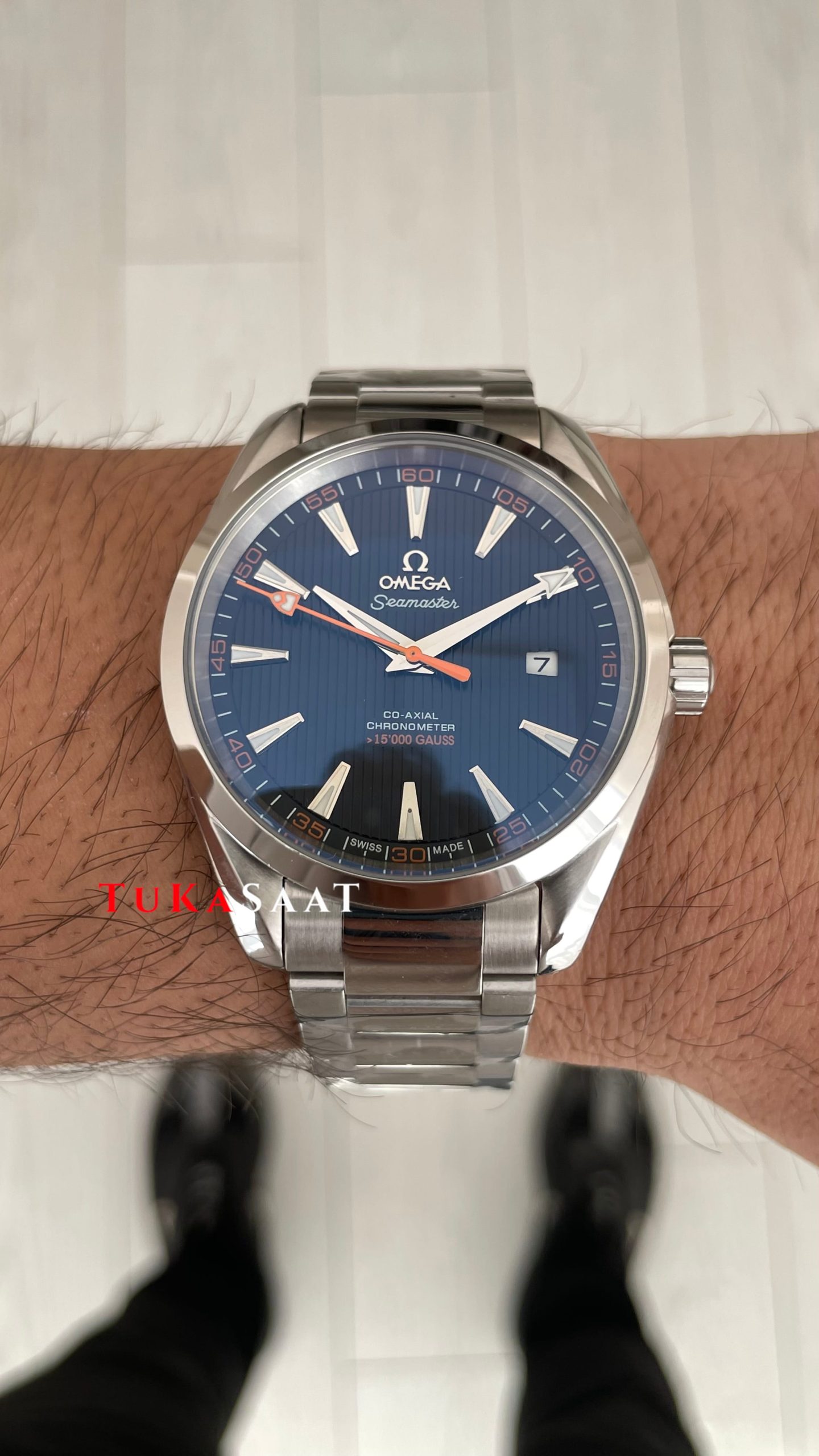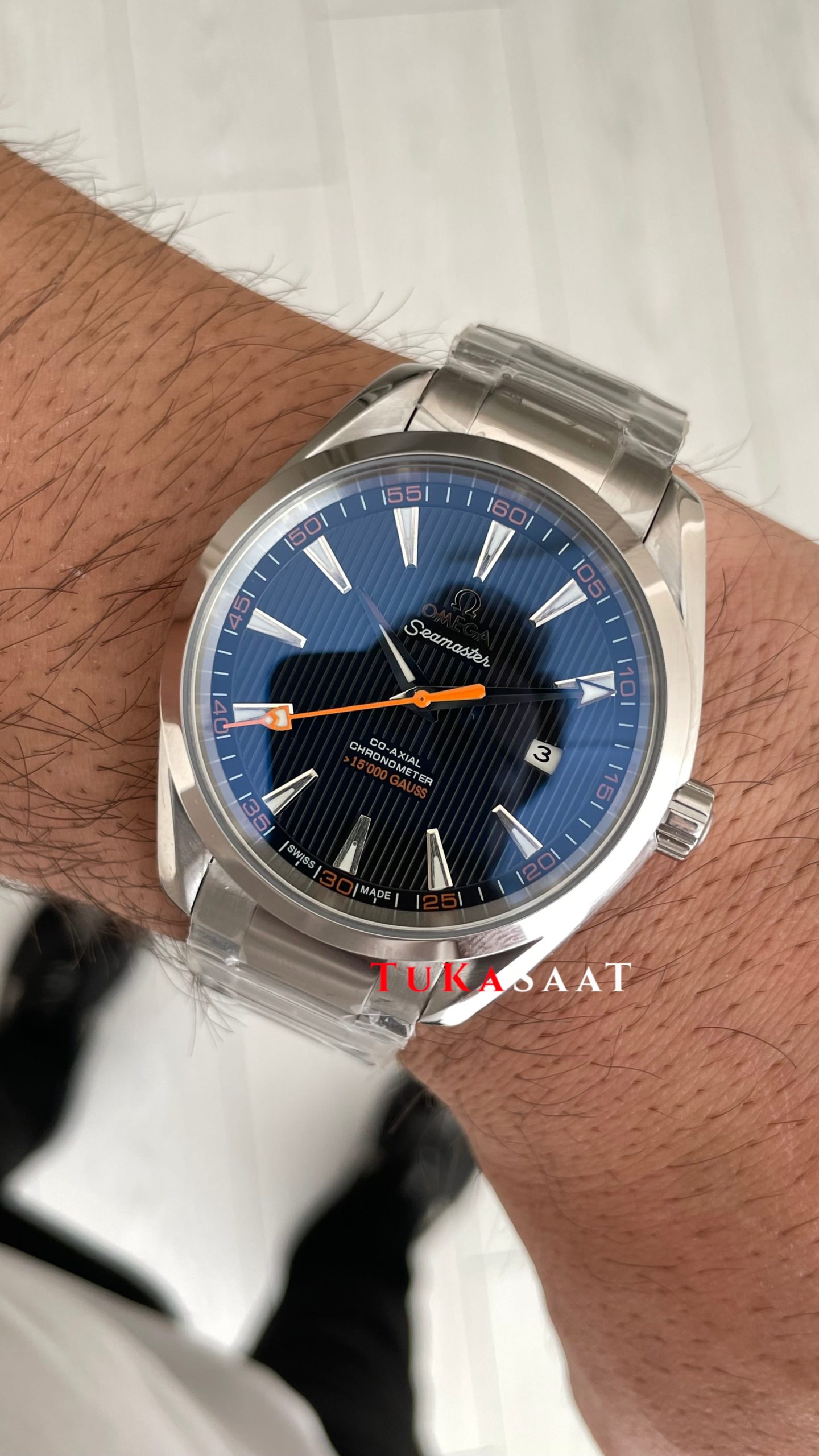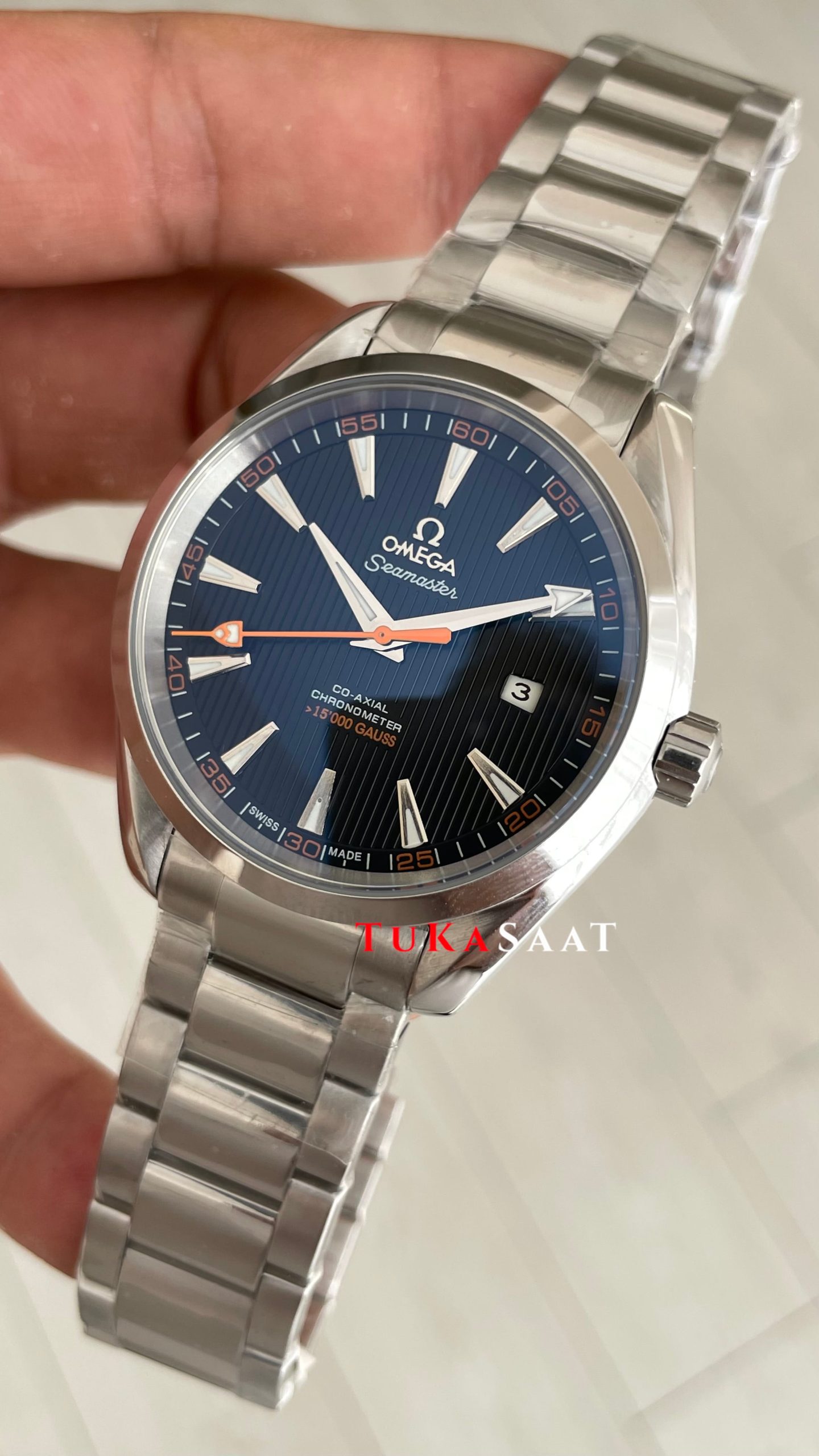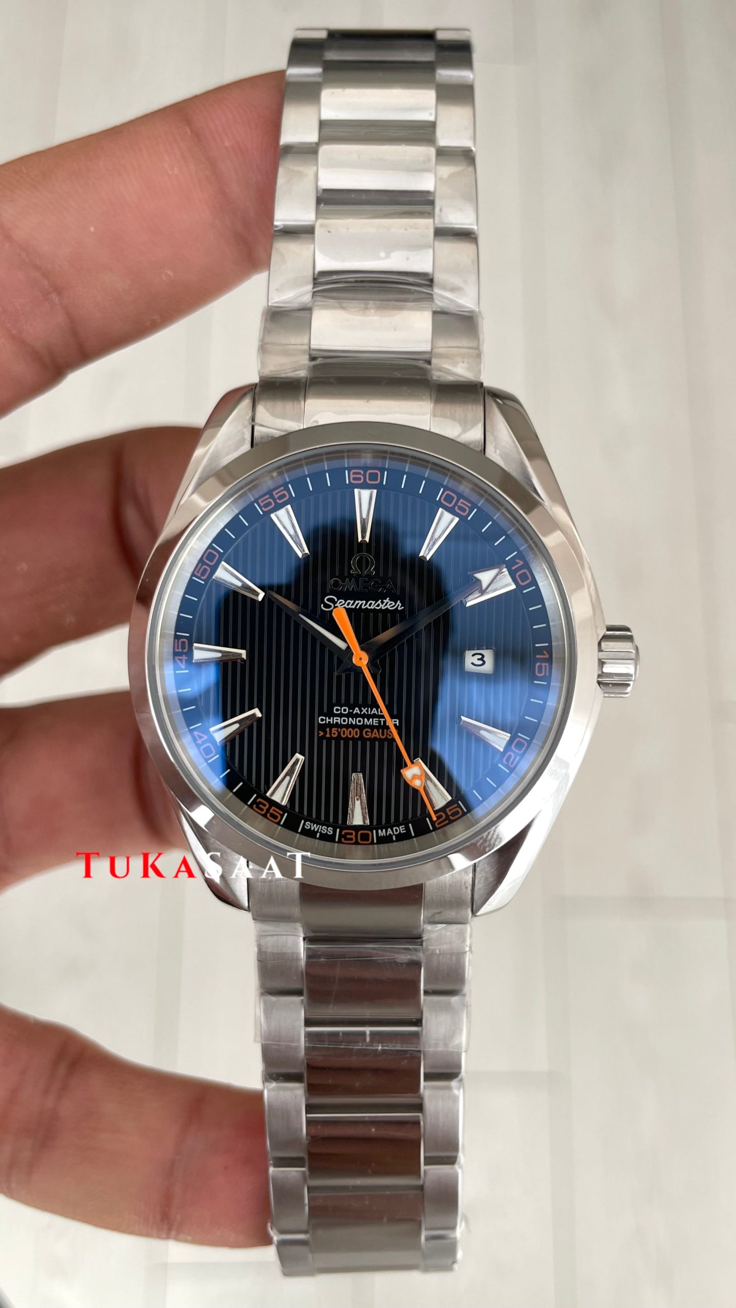 Omega Seamaster Aqua Terra Siyah 41mm Erkek Kol Saati modelinin kadran tasarımında ki, mikron ayrıntıları, düz çizgili indeksleri, turuncu saniye ibresi, akrep ve yelkovanının berraklığı, akar saniyesi ve tik ağacı desenli kadranı markanın imza niteliğinde olmasıdır. Beyaz & mavi renk fosforlu ibreleriyle kusursuz uyum içindedir. Mavi kadran rengi özgüvenli ve güçlü bir görünüm sunmayı seven erkekler için ideal bir seçenek ve her anınıza ayrıcalık katacaktır.