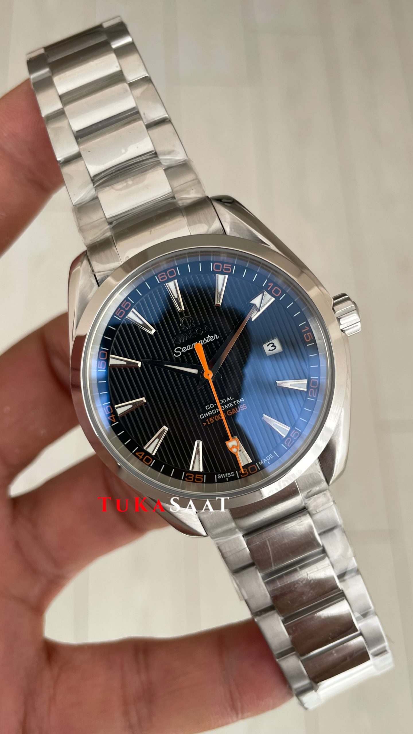 Omega Seamaster Aqua Terra Siyah 41mm Erkek Kol Saati modeli, kendine has tarzıyla ince yuvarlak çelik kasası, ince çelik bileziği, ince çelik bezeli, çift katmanlı bombeli safir camı, transparan arka kapağı, vidalı tepesi (kurma kolu), otomatik mekanizması, kadran yapısı ve 41mm kasa çapı ölçüsü ile en çok talep edilen modellerimizden biri olmayı başarmıştır. Bu saatin paslanmaz çelik kasası ve paslanmaz çelik bileziğiyle dayanıklılığı, sağlamlığı ve kullanım kolaylığını bir arada sağlayarak saatin kullanımını daha keyifli ve kolay hale getiriyor.
